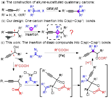 季碳中心广泛存在于复杂天然产物和药物分子结构中,尤其是炔基取代季碳中心的高效构筑一直是有机合成领域的难点之一。近年来合成化学家发展了系列通过炔基与支链单元直接偶联构建炔基取代季碳中心的方法,但大都存在末端炔较易二聚、依赖于预先功能化前体或伴随支链叔烷基单元β-H消除等不足(图1-a)。本研究提出利用重氮化合物作为“一碳”插入合成子,通过选择性地裂解炔丙醇的C(sp)−C(sp3)键来构建炔基取代季碳中心(图1-b)。研究通过评估反应条件的灵敏度展示了该方法的重现性;同时也考察了该策略对炔丙醇、重氮化合物以及羧酸的适用范围,并通过核磁共振、单晶X射线衍射、高分辨质谱等进行分析表征;结合系列控制实验及密度泛函理论计算提出了可能反应机理(图1-c)。