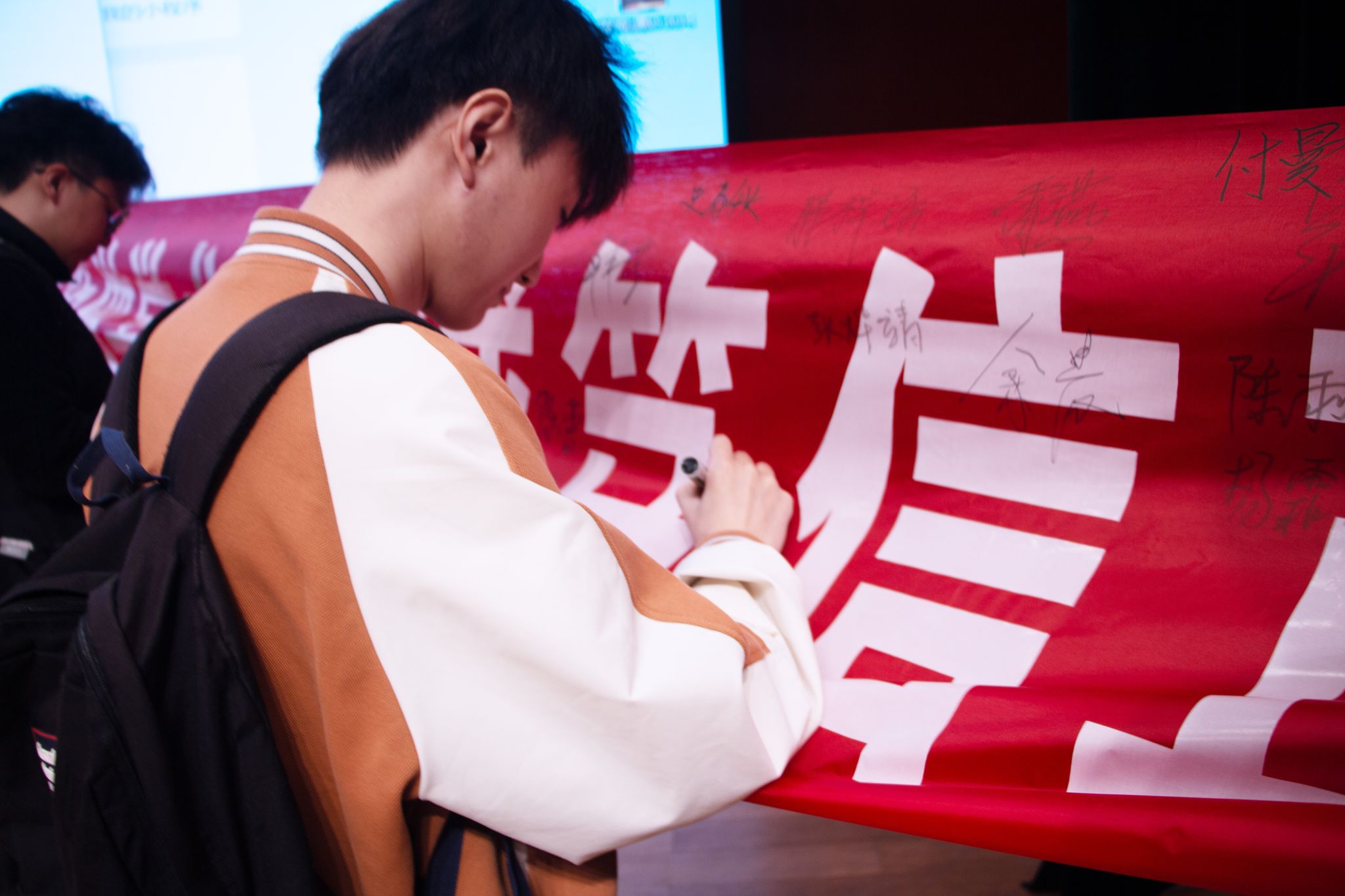 师生代表,在“守规守矩做学术,笃诚笃信正学风”的横幅上郑重签名,承诺尊重他人成果,尊重知识产权,对个人学术成果负责,对自身学术生涯负责。