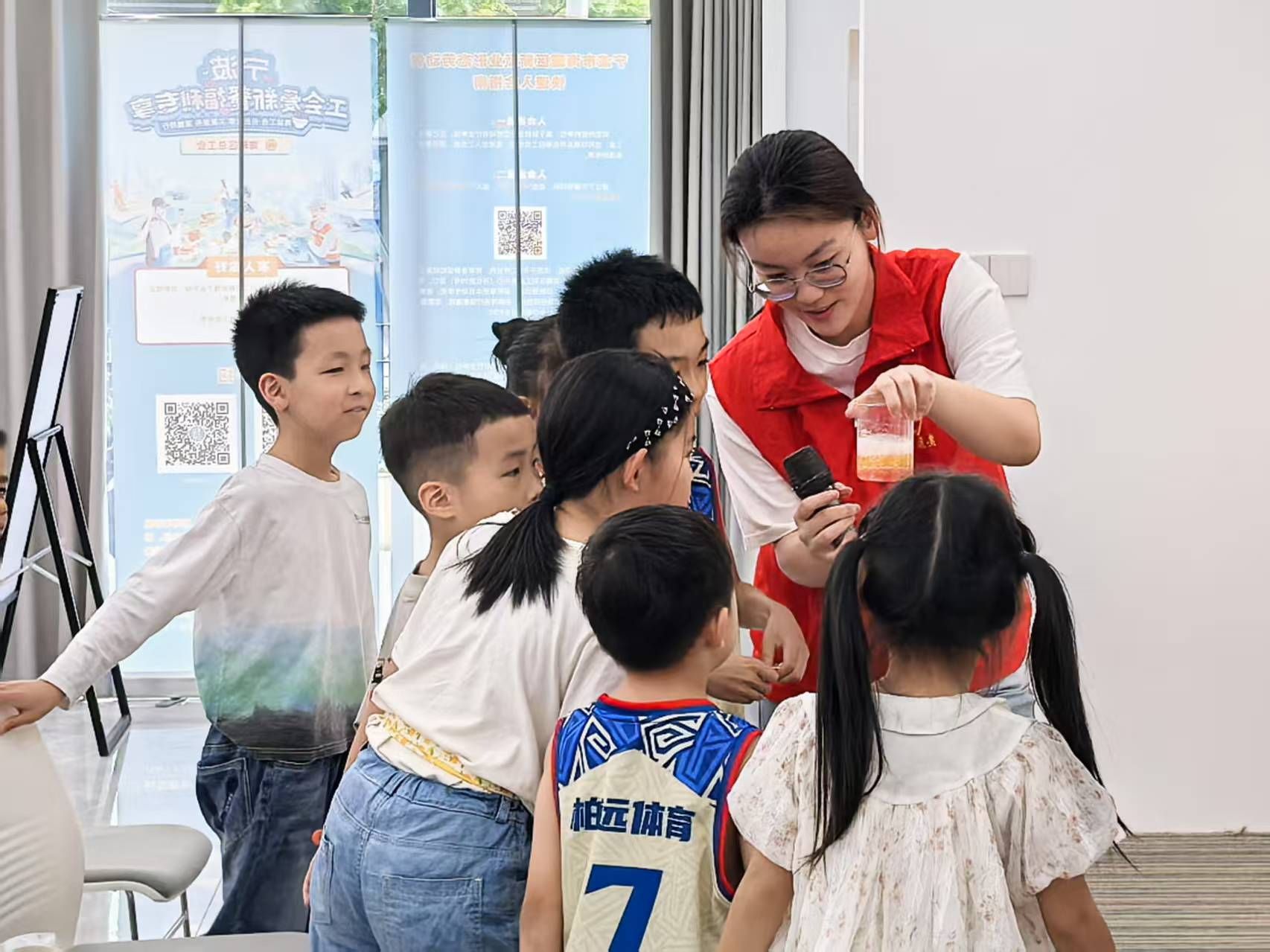 结合“双碳”环保主题,志愿者们开展科普实验,宣讲科学家精神。志愿者们设计“熔岩之舞”等实验,直观展现地质运动的壮美,志愿者们借实验现象阐述生态保护理念,同时借助热冰实验,讲述居里夫人提炼镭元素、门捷列夫创制元素周期表的科学故事,让科学家的探索精神在孩子们心中生根发芽。
