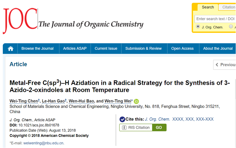 2015级本科生陈伟婷在美国化学会旗下TOP期刊Journal of Organic Chemistry上以第一作者发表了题为“Metal-Free C(sp3)-H Azidation in a Radical Strategy for the Synthesis of 3-Azido-2-oxindoles at Room Temperature”的研究论文(DOI: 10.1021/acs.joc.8b01678),PG官方电子网
