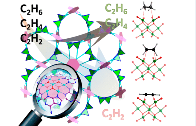 乙烯(C2H4)作为重要的化工原料,广泛应用于聚乙烯的生产过程中。然而,乙烯中痕量乙炔的消除是工业分离中一个至关重要的过程,乙炔的存在不仅会使聚合用的催化剂中毒,而且可能形成固体金属乙炔化物阻塞管道进而引起爆炸。目前,工业上常用的方法包括溶剂吸收和乙炔选择性催化加氢,都存在能耗高、效率低且对环境不友好的不足。因此,新的分离纯化乙烯的方法和材料对于工业生产具有重要的意义。