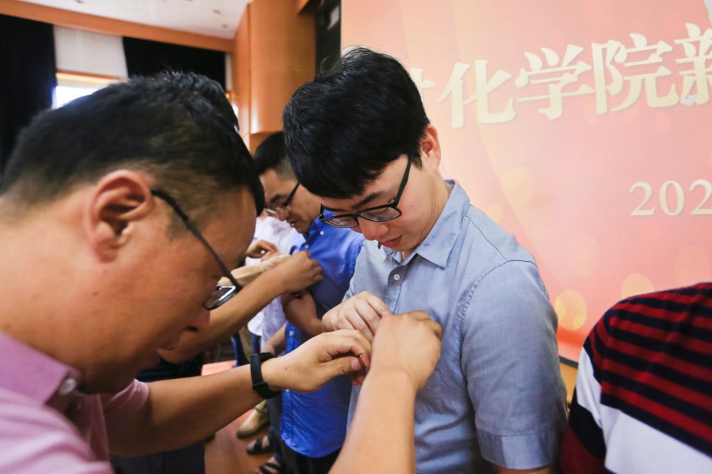 院领导和老教师为新教师佩戴校徽,新教师代表发言表示一定要继续传承发扬老教师的优良品德,以“四有”好老师的标准严格要求自己,以身作则,立德树人。