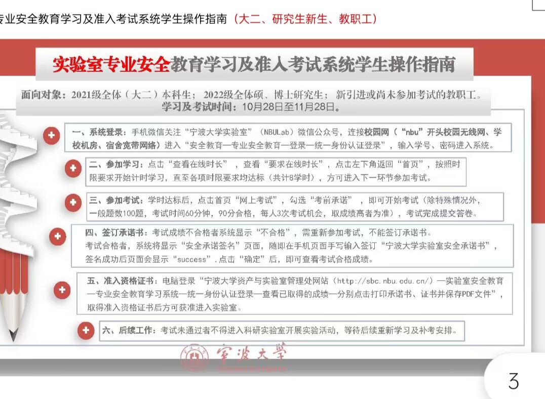 5)准入资格证书:电脑登录“PG官方电子网 资产与实验室管理处网站//sbc.nbu. edu.cn/—实验室安全教育—专业通识教育学习系统—考生统一身份认证登录—在线考试—成绩查询—分别点击打印考试承诺书、证书并保存PDF文件”,取得准入资格证书后方可获准进入实验室。