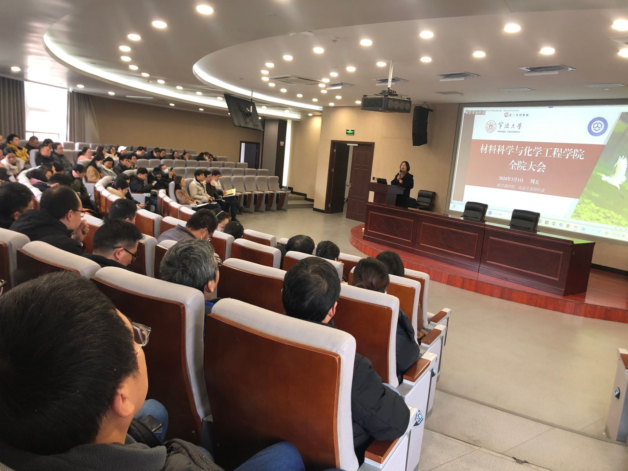 在北区杨咏曼楼报告厅召开新学期全体教职工大会,传达学习上级精神、布置新学期工作,会议由党委书记陶娟主持。
