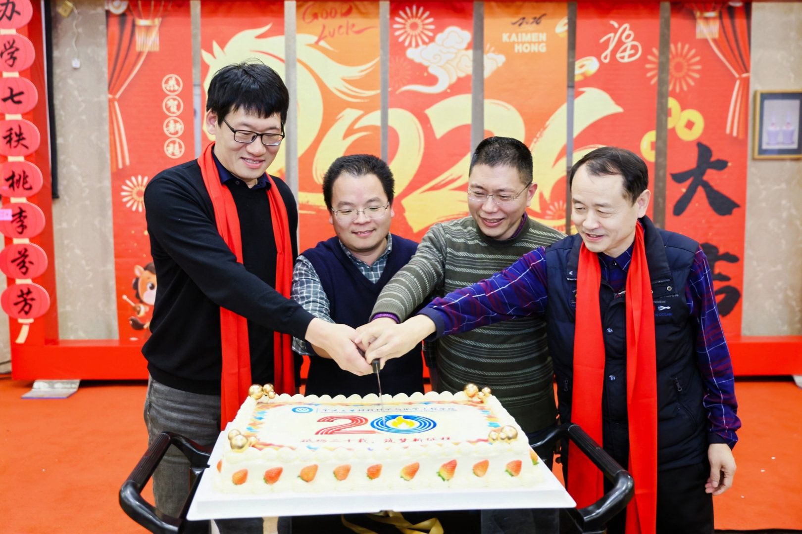 20周年华诞的美好祝福和对未来发展的坚定信心。四位代表与现场教职工共同分享这份喜悦,定格下温馨感人的瞬间。