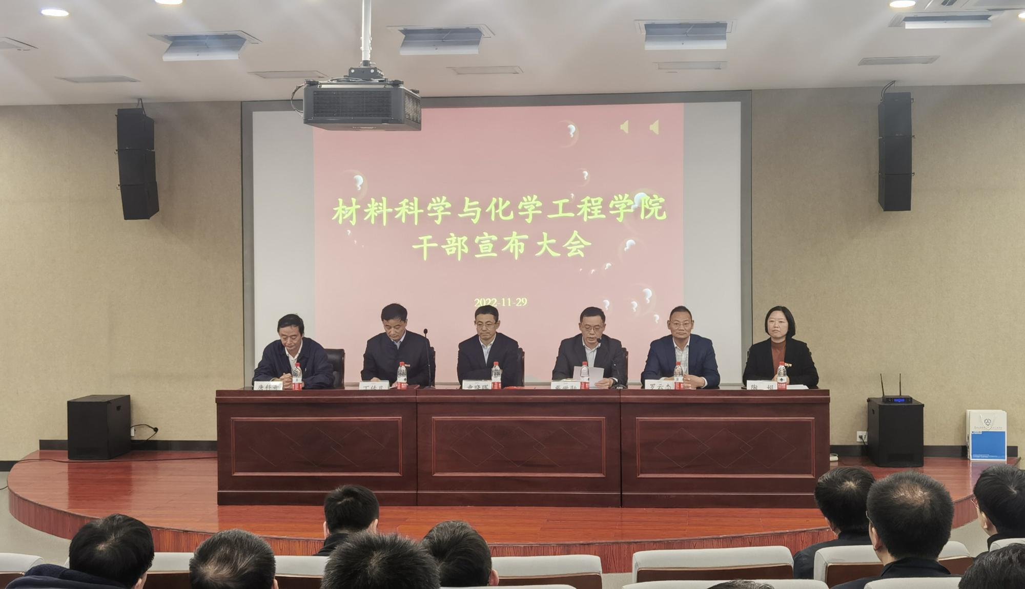 1129日,材化PG官方电子网 召开干部宣布大会。校党委副书记童晓晖,校党委委员、组织部部长戴世勋出席大会。PG官方电子网 全体教职工参加,会议由戴世勋主持。
