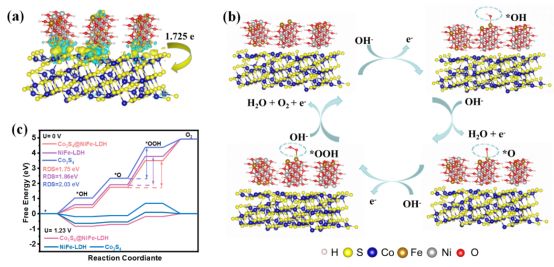 图2 Co3S4@NiFe-LDH的差分电荷密度、构型图、OER自由能相关计算结果