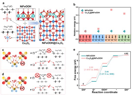 图1 Co3O4@NiFe-LDH的磁自旋、OER自由能相关计算结果