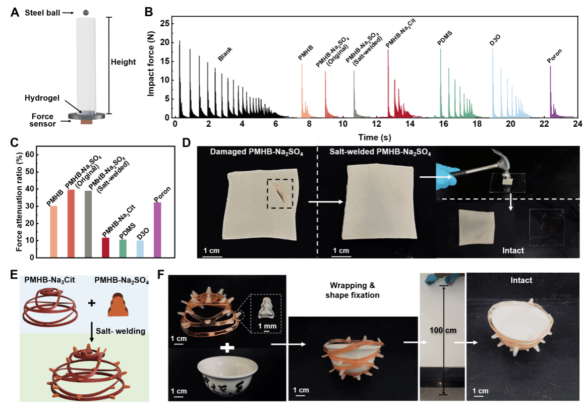 研究者通过盐处理赋予了材料抗冲击、耐磨损等多种优异性能。在经过柠檬酸钠处理后,该材料的耐磨表现优于金属钛、接近于特氟龙。在经过硫酸钠处理后,该材料的减震效果优于硅橡胶、D3O等商品化阻尼材料。此外,材料在被破坏后还可以进行修复,其抗冲击和耐磨损性能可以恢复如初。结合其快速修复的特点,该材料有望在人体运动防护、电子设备防护等领域发挥应用潜力。
