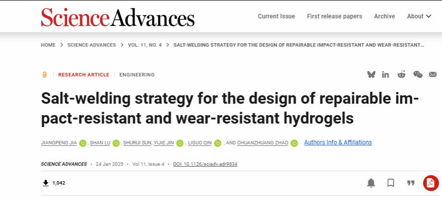 的研究者发现了一类高分子水凝胶具有“时盐等效”现象(Macromolecules 2024, 57, 2746),它的分子在某些盐的作用下可以加速运动使得材料变得像水一样柔软,在某些盐的作用下又可以凝聚起来使得材料变得像塑料一样坚硬。基于此,研究团队提出了“盐焊接水凝胶”,仅需在室温下的盐溶液中简单浸泡95分钟,就使得水凝胶恢复了23 MPa的断裂强度,超越了同类型材料的修复速率。相关成果发表在Science Advances(Science Advances 2025, 11, eadr9834)。