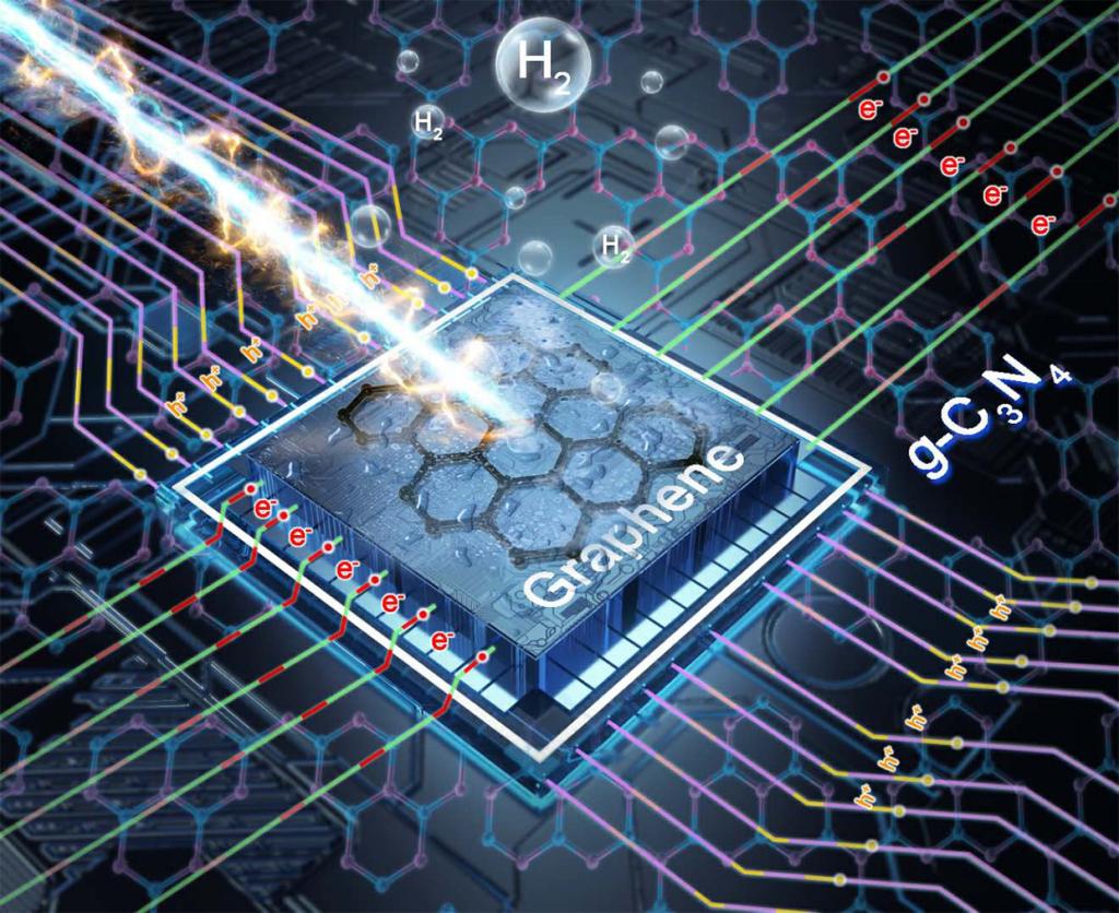 该研究报道了以g-C3N4三角孔洞处的sp2杂化N原子为生长位点,在g-C3N4上原位生长石墨烯,在石墨烯和g-C3N4之间形成紧密无障碍的连接,由于石墨烯和g-C3N4之间正负电荷中心不重叠,从而形成自发极化电场,打破光生电荷间库伦场的束缚,促进光生电荷在空间上的分离和转移。因而在太阳能燃料光催化转化过程中,高效地实现氢燃料的合成,并连续释放氢气泡。