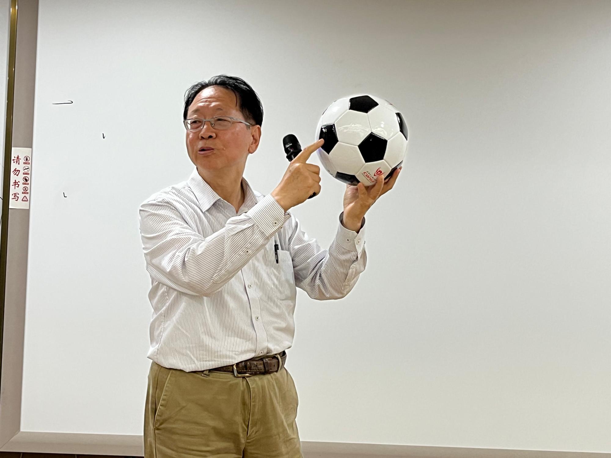 师生们解释了原子团簇的相关问题,阐述了纳米材料与原子团簇的区别。随后,郑院士用足球做教具,生动形象地讲解了C60的结构和原子团簇研究进展,展望了学科发展的前景。