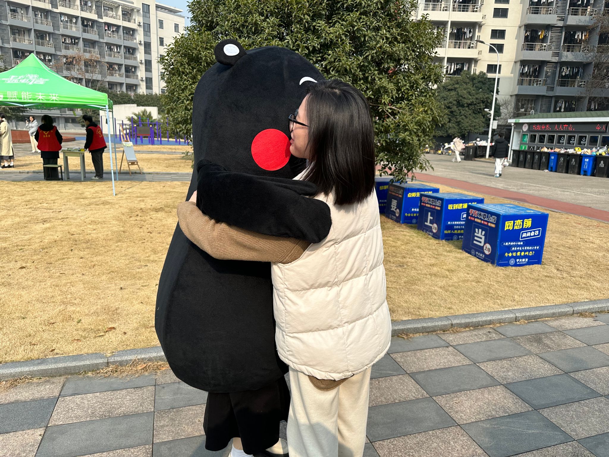 活动包括五项内容。 “Free hug”,身穿熊本熊玩偶服的志愿者给予前来参加活动的同学们一个大大的拥抱,鼓励他们摆正心态,轻松应考;“心语集结”,同学们在白板和明信片写下自己的烦恼与困惑、鼓励与加油,相互加油鼓劲;“指尖造趣”,同学们用生花妙笔手工制作专属自己的DIY帆布包,画出自己的心情;“抗压拼图”,打卡通关、拼出自己喜爱的图像;“体”现自我,通过参与跳长绳、跳房子等妙趣横生的童年游戏,在律动与汗水中共同释放压力。