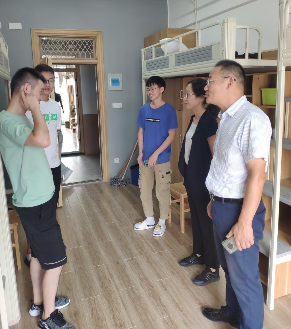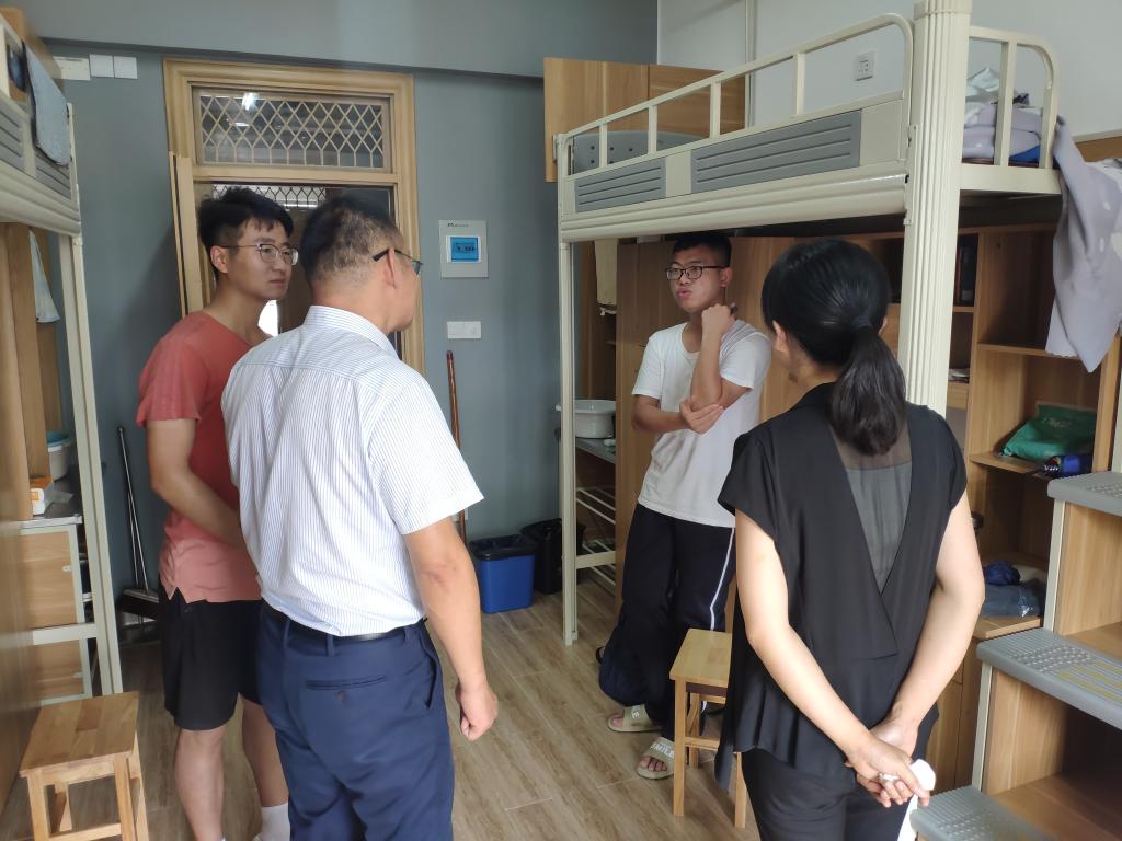 的关怀和温暖,9月9日中午,院党委书记罗云杰,院党委副书记朱燕带领学工办主任韩鸿儒、辅导员们一起走访了研究生新生宿舍。