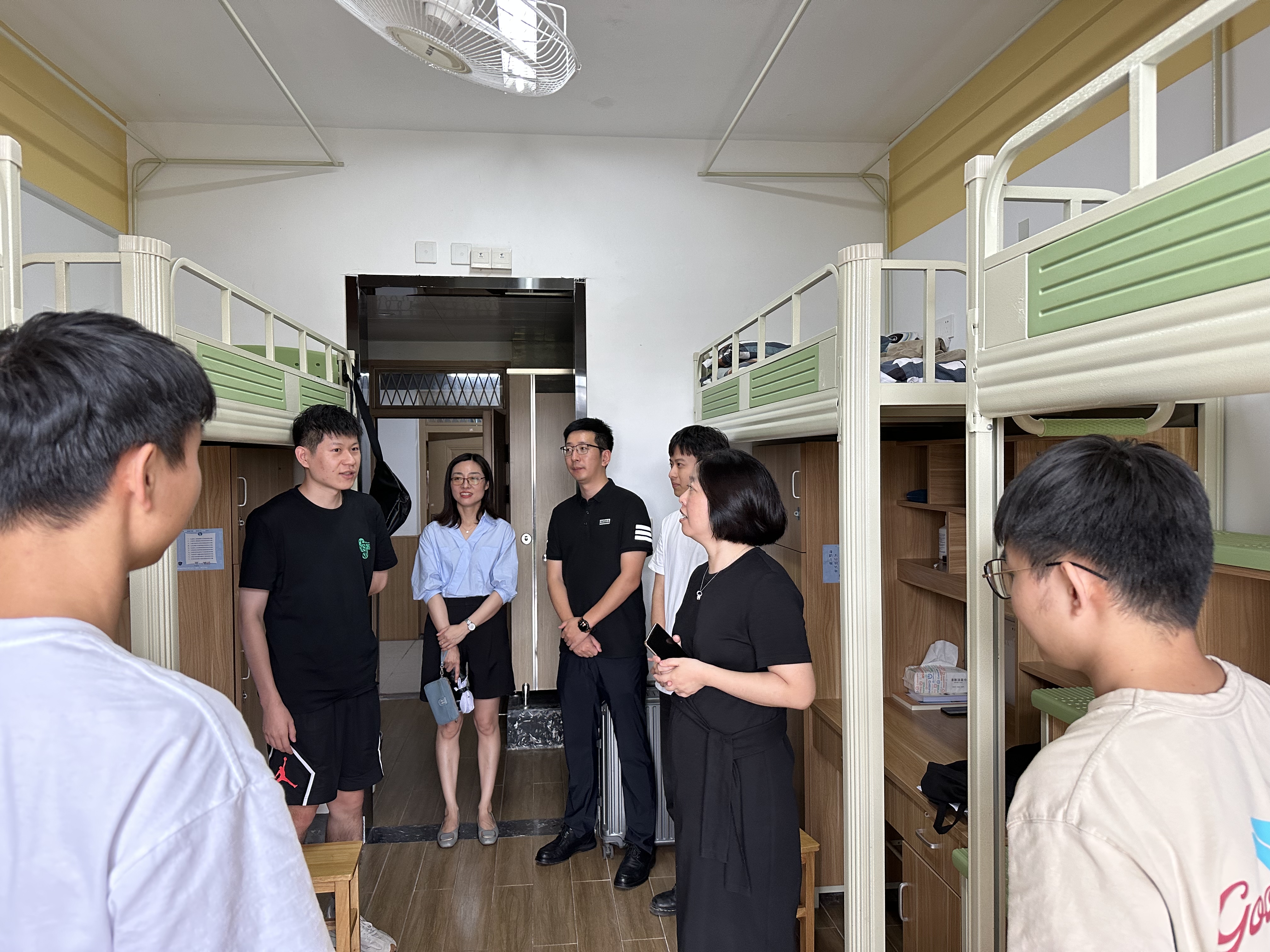 在新生宿舍,陶娟热情地询问同学们生活方面的适应情况,鼓励新生们多与学长学姐和老师们交流,健康生活,同时要求新生们认真学习实验室安全相关规程,打好科研基础。周明炯就导师选择、科研准备等相关问题解答了同学们的疑惑,勉励同学们珍惜这段跨越山海、来自五湖四海聚在一起的缘分,互帮互助、共同成长。尹慧就宿舍卫生管理、住宿安全事项等对新生们进行了提醒,用文明整洁的住宿环境开启人生的新阶段。