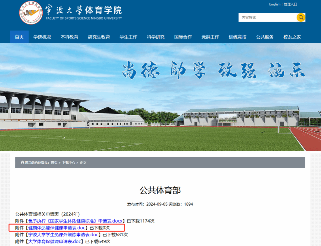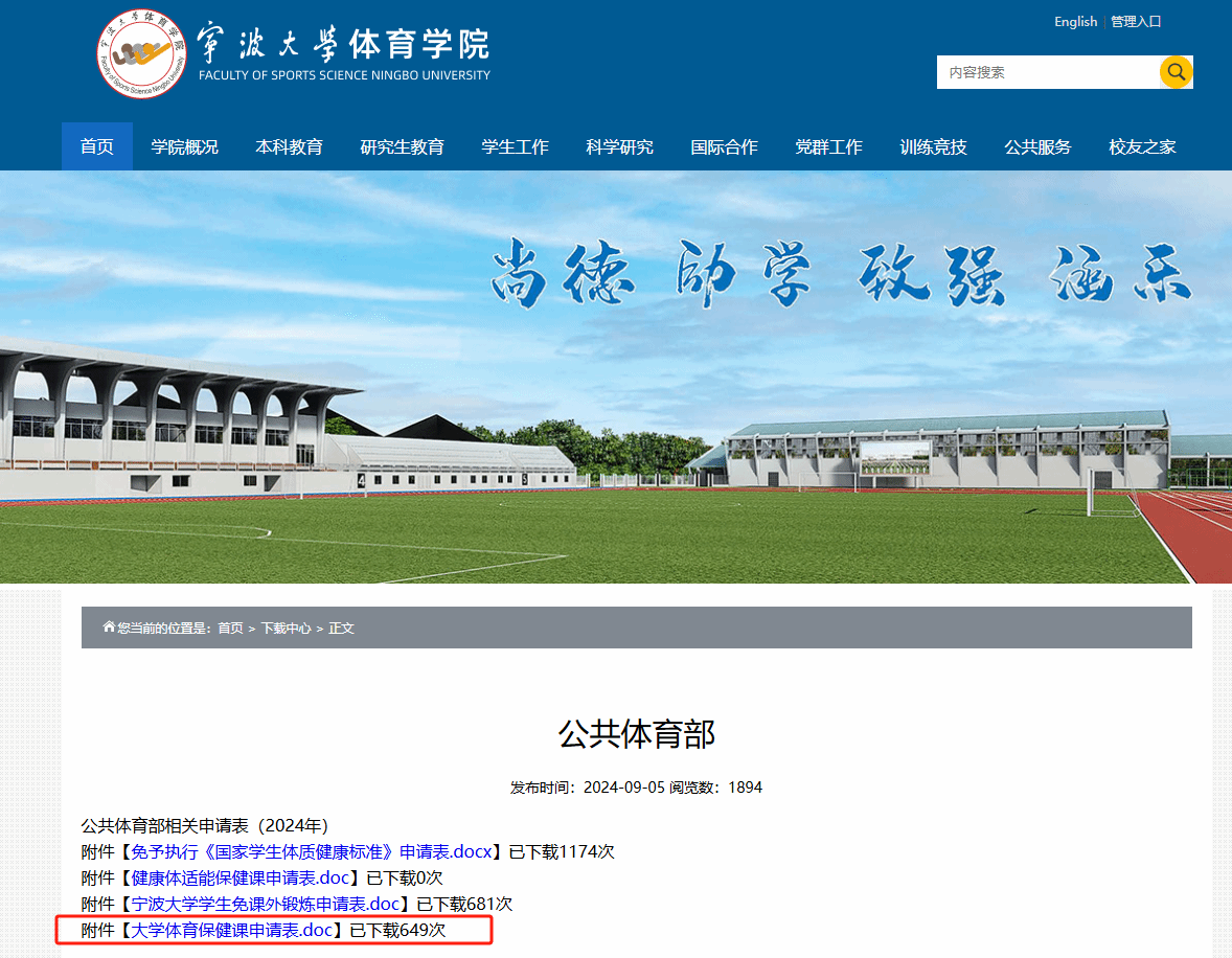下载并填写《大学体育保健课申请表》(下载流程见下图),附上诊断书和证明资料,先交原体育课任课老师签字(若未选大学体育课则无须签字),后至本部田径场司令台下方A101室找陈奂老师审核并签表,最后再到体育PG官方电子网