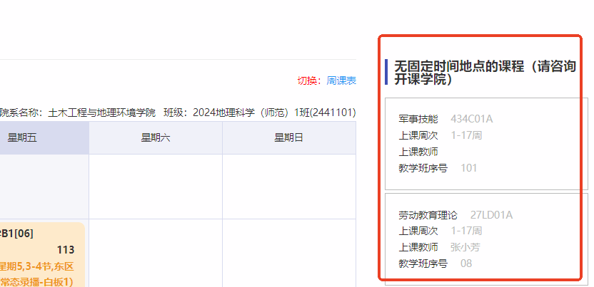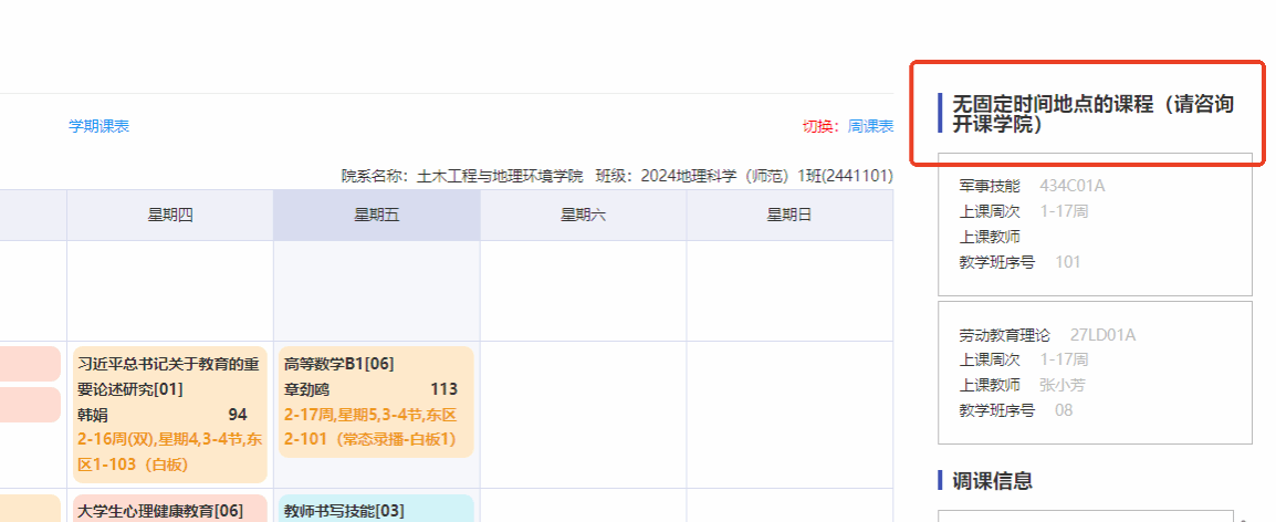 3.同学进入“我的课表”app查询课表的时候看到右上角有“无固定时间地点的课程(请咨询开课PG官方电子网