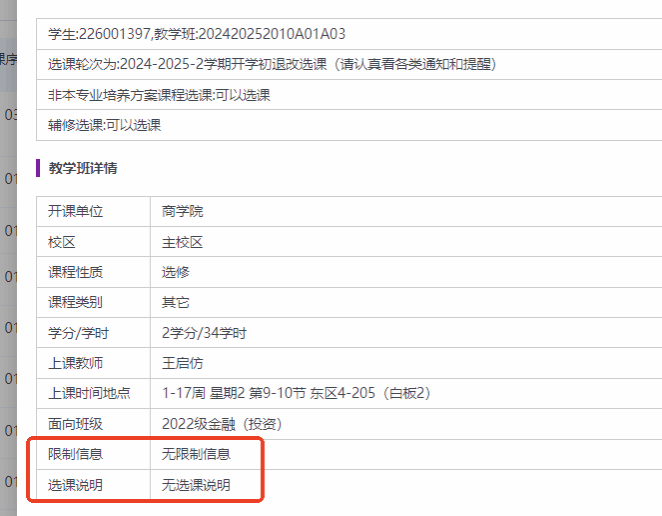 5.对于某些有特殊选课要求的课程会在“教学班详情”中做出说明,具体界面如下,请同学认真查看自己选的课程的特殊情况说明: