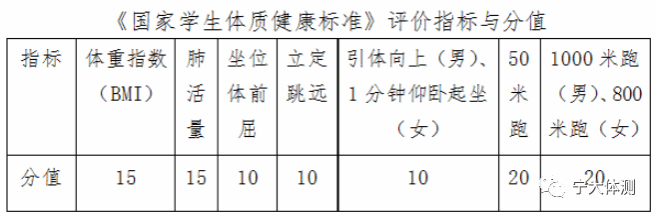 4. 学年总分(满分100分)=标准分+附加分。标准分由各单项指标得分与权重乘积之和组成,满分为100分。附加分根据实测成绩确定,即对成绩超过100分的加分指标进行加分,满分为20分;加分指标为男生引体向上和1000米跑,女生1分钟仰卧起坐和800米跑,各指标加分幅度均为10分。